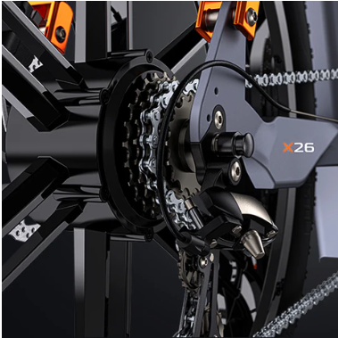 Il design dell’ENGWE X26 unisce robustezza, linee moderne ed estetica funzionale. Il telaio massiccio in lega di alluminio 6061 ha un aspetto futuristico, pur garantendo stabilità e resistenza anche in condizioni difficili. La bici dispone di un sistema di sospensioni triple – anteriore idraulica, centrale meccanica e posteriore ad aria – che assorbono le irregolarità e offrono un esperienza di guida fluida. A completare il tutto ci sono gli pneumatici fat 26×4.0″, che garantiscono trazione e stabilità eccellenti su asfalto, ghiaia, sabbia o neve. La frenata è affidata a freni a disco idraulici reattivi anche alle alte velocità. La bici è equipaggiata con una luce LED anteriore ad alta luminosità e una luce posteriore di frenata, che assicurano massima visibilità anche nelle uscite notturne. Il display LCD sul manubrio mostra velocità, livello batteria, distanza percorsa e modalità di guida. Il cambio SHIMANO a 8 velocità offre cambi marcia fluidi e precisi. L’ENGWE X26 è quindi una combinazione di design premium, tecnologia intelligente e dotazioni pratiche, capace di stupire in ogni dettaglio.