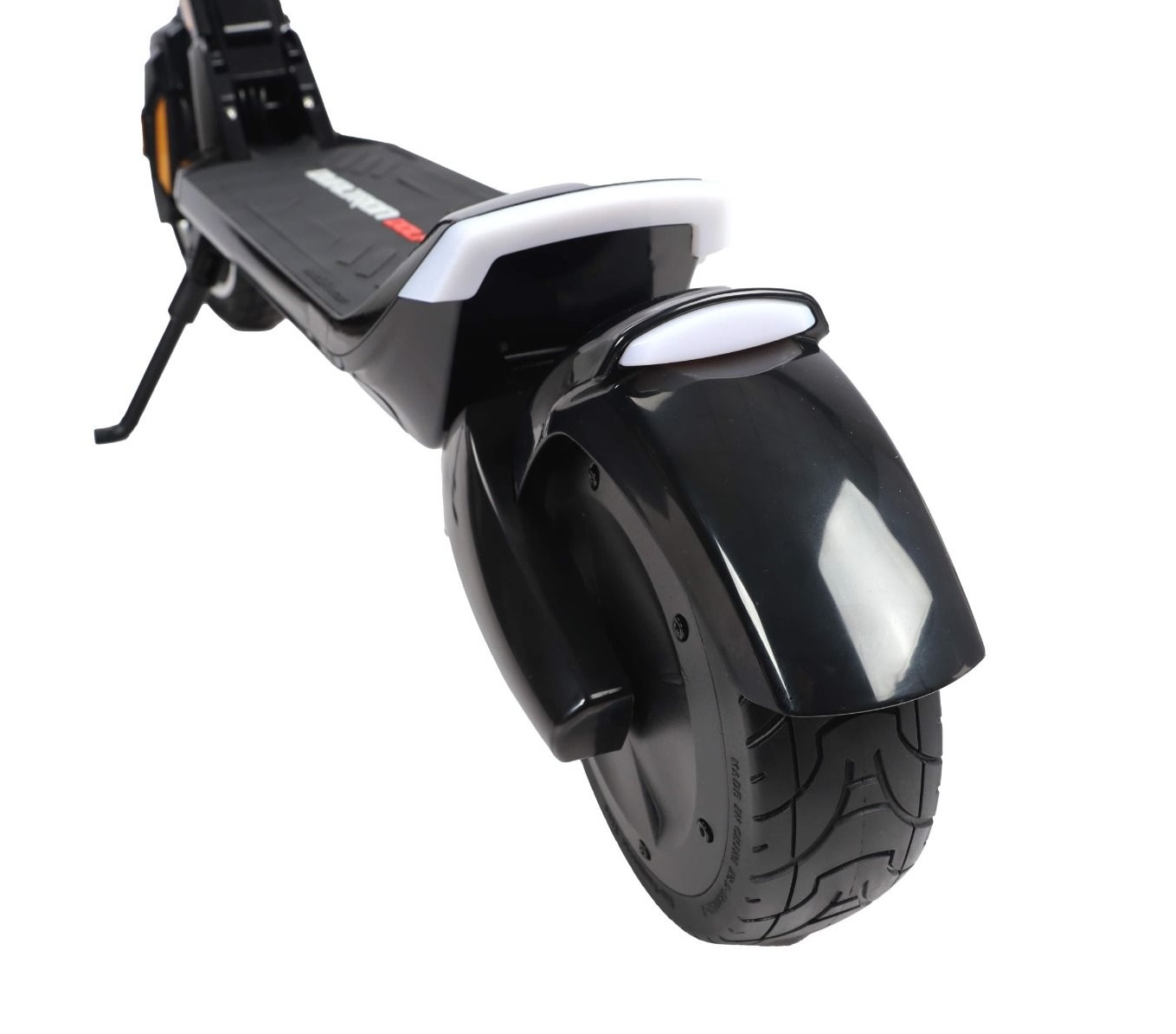Il DUALTRON Dolphin 2025 colpisce a prima vista con il suo design elegante e sportivo, che combina elementi futuristici con praticità. Il telaio è realizzato in lega di alluminio 6061-T6 di alta qualità, che garantisce resistenza e peso ridotto – solo 21,8 kg (versione 12 Ah). L’apertura e la chiusura richiedono pochi secondi grazie al robusto meccanismo di piegatura con blocco di sicurezza. Il manubrio regolabile in altezza, il display LCD EY3 retroilluminato e i comandi intuitivi forniscono tutte le informazioni necessarie – velocità, modalità di potenza, stato della batteria. Tra le dotazioni figurano luci LED anteriori e posteriori, inclusa luce di stop e illuminazione ambientale sotto la pedana, che aumentano lo stile e la visibilità al crepuscolo. Non mancano forcelle ammortizzate anteriori e posteriori per una guida fluida anche su strade dissestate. Gli pneumatici da 9 pollici sono tubeless e dotati di protezione antiforatura, riducendo notevolmente il rischio di forature.