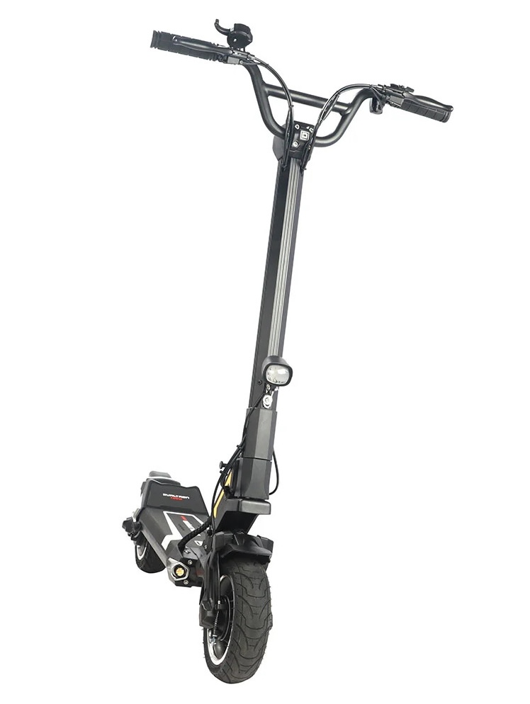 Il monopattino Dualtron Togo 2025 sfoggia un design minimalista ma funzionale, che trasmette un’impressione di compattezza e al tempo stesso di robustezza. I telai sono saldati in lega di alluminio, garantendo un rapporto ottimale tra rigidità e peso contenuto. Da aperto misura 1 200 × 615 × 1 130 mm, mentre da chiuso occupa 1 160 × 615 × 400 mm, il che ne facilita il trasporto o il posizionamento nel bagagliaio dell’auto o sui mezzi pubblici. La dotazione luminosa è completa: faro LED anteriore, luce posteriore di posizione e stop, oltre a indicatori di direzione, per aumentare la visibilità su strada. Il display a cinque livelli EY2 APP mostra velocità, stato della batteria e distanza percorsa, ed è pienamente connesso all’app mobile per iOS e Android. La pedana è rivestita in gomma antiscivolo per un’aderenza eccellente, mentre il poggiapiede facilita la sosta. Molle a pistone sulla forcella anteriore e posteriore assorbono gli urti e smorzano efficacemente le irregolarità dell’asfalto; insieme agli pneumatici gonfiabili da 9" (70/50–6,1) assicurano comfort anche sui marciapiedi sconnessi.
