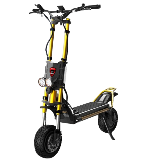 Il KAABO Wolf King GTR è un monopattino elettrico che porta le prestazioni e la tecnologia a un livello completamente nuovo. Questo modello è progettato per i piloti che cercano un’esperienza di guida di alto livello, comfort massimo e prestazioni estreme combinate con le funzionalità più moderne. Con i motori doppi da 2000 W facilmente smontabili, offre potenza senza precedenti e flessibilità nella manutenzione. La velocità massima raggiunge i 105 km/h, rendendolo uno dei monopattini elettrici di serie più veloci al mondo. Grazie alla potente batteria da 2419 Wh (LG INR21700-M50, certificata UL-2271) può percorrere fino a 180 km per singola carica, consentendo lunghi percorsi senza ricariche frequenti. Il Wolf King GTR può affrontare pendenze fino al 50°, gestendo facilmente anche salite ripide. La struttura robusta, con un peso di circa 63 kg, garantisce stabilità anche ad alte velocità, mentre la sospensione avanzata e l’equipaggiamento premium rendono questo monopattino il vero re di strada e fuoristrada.