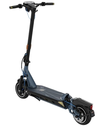 Il design del KingSong N12 Pro unisce tecnologia robusta ed estetica moderna ed elegante. Le dimensioni da aperto sono 1295 × 645 × 1270 mm e da chiuso 1295 × 645 × 610 mm, il che consente un trasporto e una sistemazione facile, ad esempio nel bagagliaio dell’auto o sotto una scrivania. Il telaio in lega di alluminio è progettato per sopportare carichi elevati, uso quotidiano e vibrazioni. Il monopattino monta pneumatici da 10 pollici combinati con sospensioni anteriori e posteriori (dual suspension), che migliorano notevolmente il comfort riducendo urti e irregolarità della strada. Il KingSong N12 Pro è equipaggiato con un display LCD intelligente che mostra velocità, livello batteria, modalità di guida e altre informazioni. Tramite Bluetooth e l’app mobile è possibile monitorare i dati di guida, modificare impostazioni, bloccare il monopattino o attivare l’allarme antifurto. La dotazione comprende inoltre un faro LED anteriore, una luce freno posteriore, indicatori di direzione e persino illuminazione ambientale RGB sulla pedana, che migliora la visibilità e aggiunge stile. Il meccanismo di chiusura rapido permette di piegare il monopattino in pochi secondi, ideale per gli spostamenti quotidiani. Ogni dettaglio – dalle manopole ergonomiche alla pedana antiscivolo – è stato progettato per offrire il massimo comfort e sicurezza.