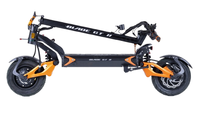 Il design del Teverun Blade GT+ II unisce un aspetto sportivo e aggressivo a una struttura estremamente robusta, progettata per sopportare carichi elevati e prestazioni a lungo termine. In posizione aperta, il monopattino misura circa 1300 × 1280 × 650 mm, offrendo una posizione di guida stabile, una pedana ampia e un controllo eccellente anche ad alte velocità. Il telaio massiccio è completato da componenti di alta qualità, come gli pneumatici tubeless autoriparanti da 11 pollici, che riducono notevolmente il rischio di forature e garantiscono una guida fluida. Comfort e resistenza sono assicurati dalle sospensioni idrauliche completamente regolabili, anteriori e posteriori, fondamentali soprattutto nell’uso fuoristrada o a velocità superiori ai 60 km/h. Il monopattino è dotato di potenti freni a disco idraulici che offrono una frenata immediata e stabile, supportata da una gestione elettronica della potenza per decelerazioni sicure. Sul fronte dell’elettronica spicca il sistema intelligente Smart BMS, che monitora lo stato della batteria, la temperatura, la tensione e le singole celle. La dotazione comprende anche un sistema di illuminazione moderno con potente faro LED anteriore, luce freno posteriore e indicatori di direzione integrati per una maggiore sicurezza nel traffico. Molto apprezzata è la presenza del blocco NFC, che consente lo sblocco tramite portachiavi o carta, aumentando notevolmente la protezione contro i furti. È inoltre disponibile la connessione con l’app mobile, che permette diagnostica, impostazioni, blocco del mezzo e profili di guida. Per design e dotazione, il Blade GT+ II è paragonabile ai migliori monopattini elettrici ad alte prestazioni.